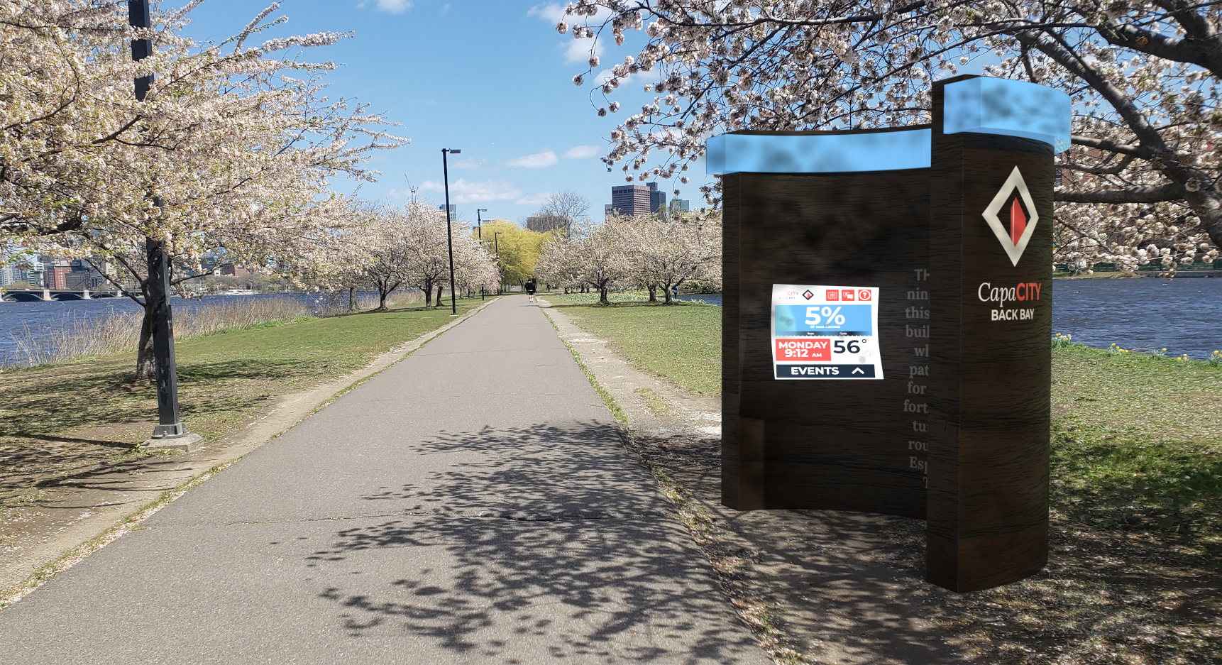 CapaCITY is a concept for an interconnected network within a city providing information about crowding and promoting the use of green space. Built around physical nodes dispersed to neighborhoods around the city, these points would act as sources of information on local crowding expectations, events, transportation, and resources.