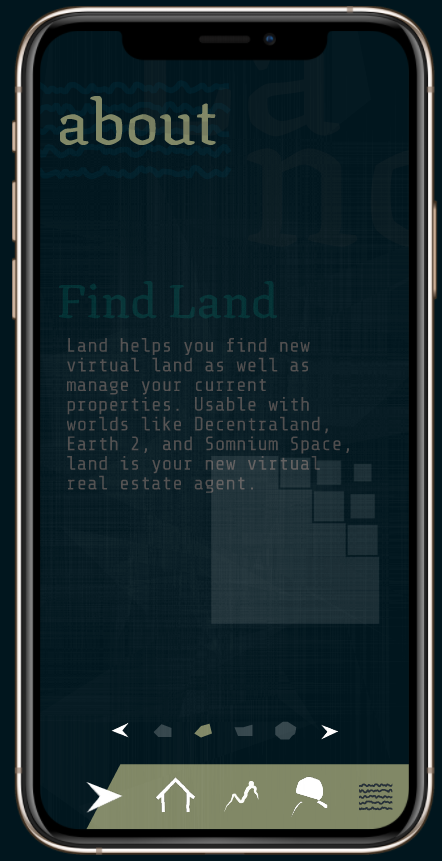 Land is an mobile application concept that helps you find new virtual land as well as manage your current properties. Usable with worlds like Decentraland, Earth 2, and Somnium Space, land is your new virtual real estate agent.